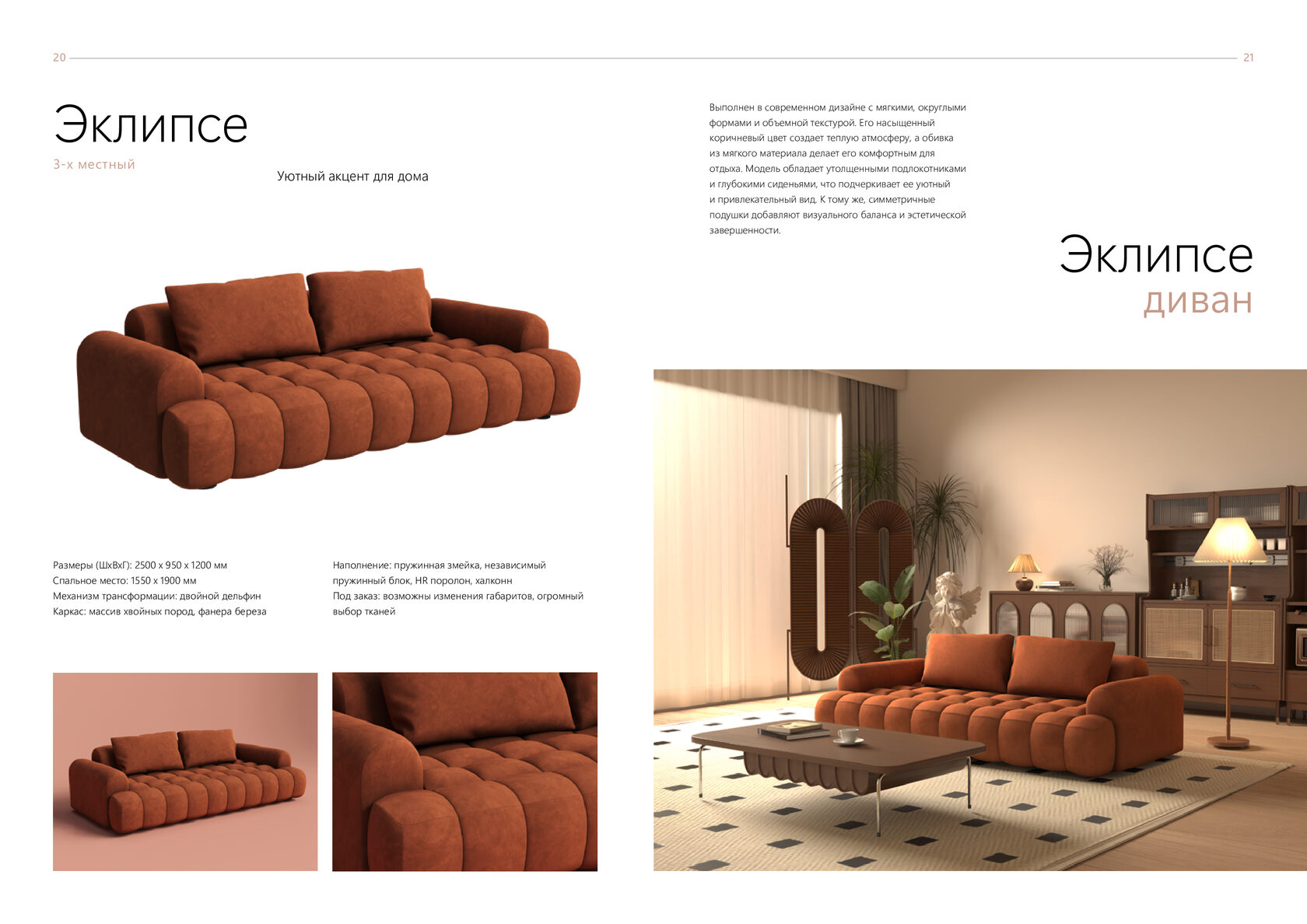Размеры (ШхВхГ): 2500 x 950 x 1200 мм Спальное место: 1550 x 1900 мм Механизм трансформации: двойной дельфин Каркас: массив хвойных пород, фанера береза