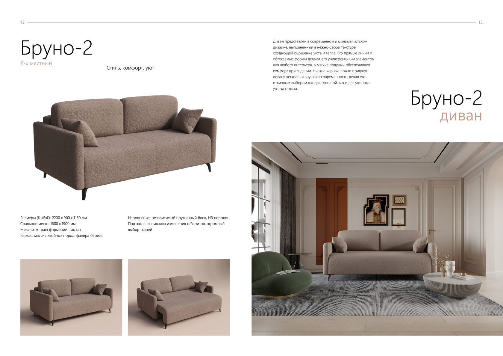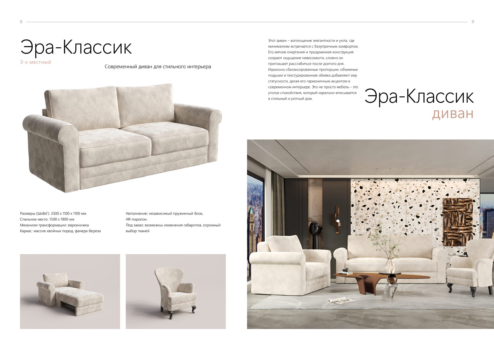Размеры (ШхВхГ): 2300 x 1100 x 1100 мм Спальное место: 1500 x 1900 мм Механизм трансформации: еврокнижка Каркас: массив хвойных пород, фанера береза