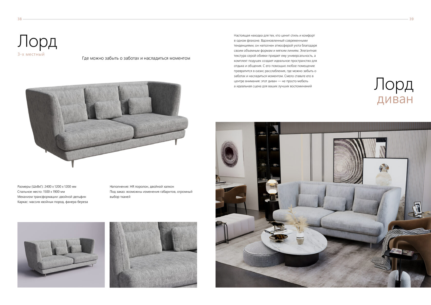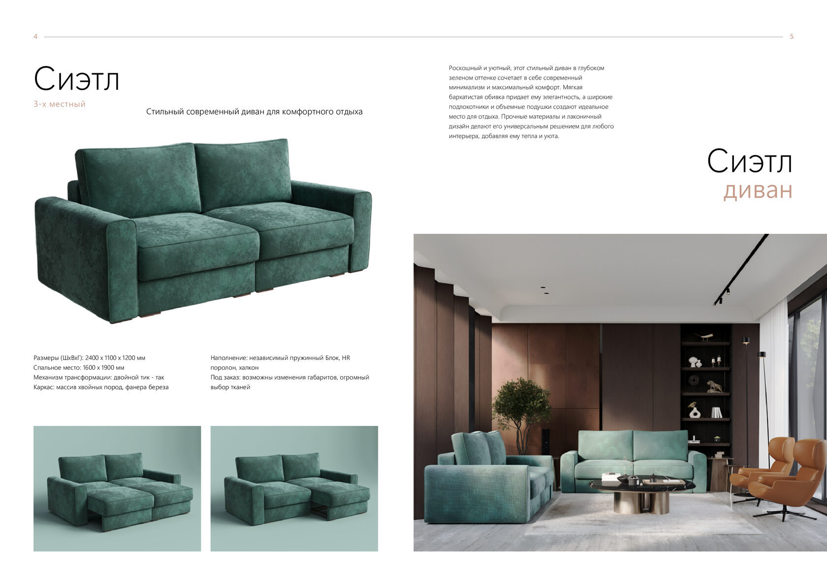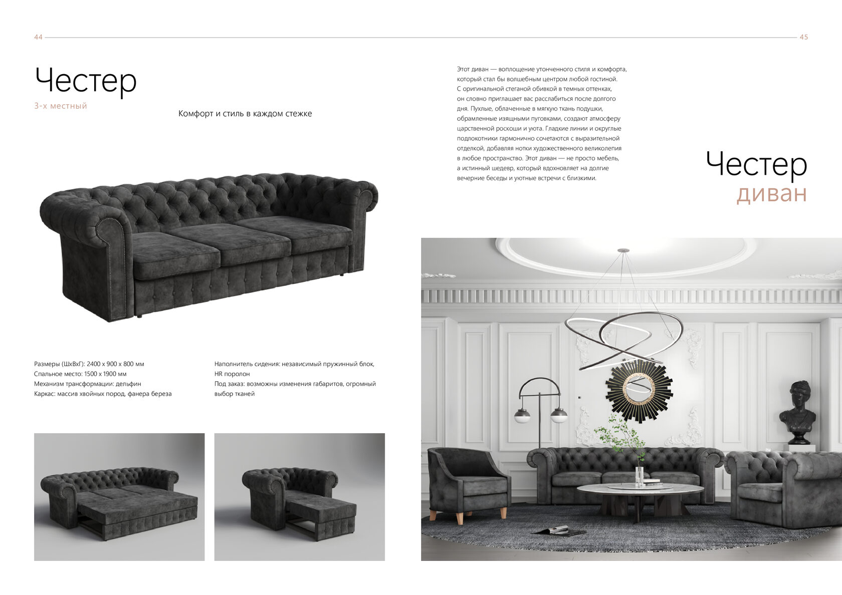 Размеры (ШхВхГ): 2400 x 1200 x 1200 мм Спальное место: 1500 x 1900 мм Механизм трансформации: двойной дельфин Каркас: массив хвойных пород, фанера береза