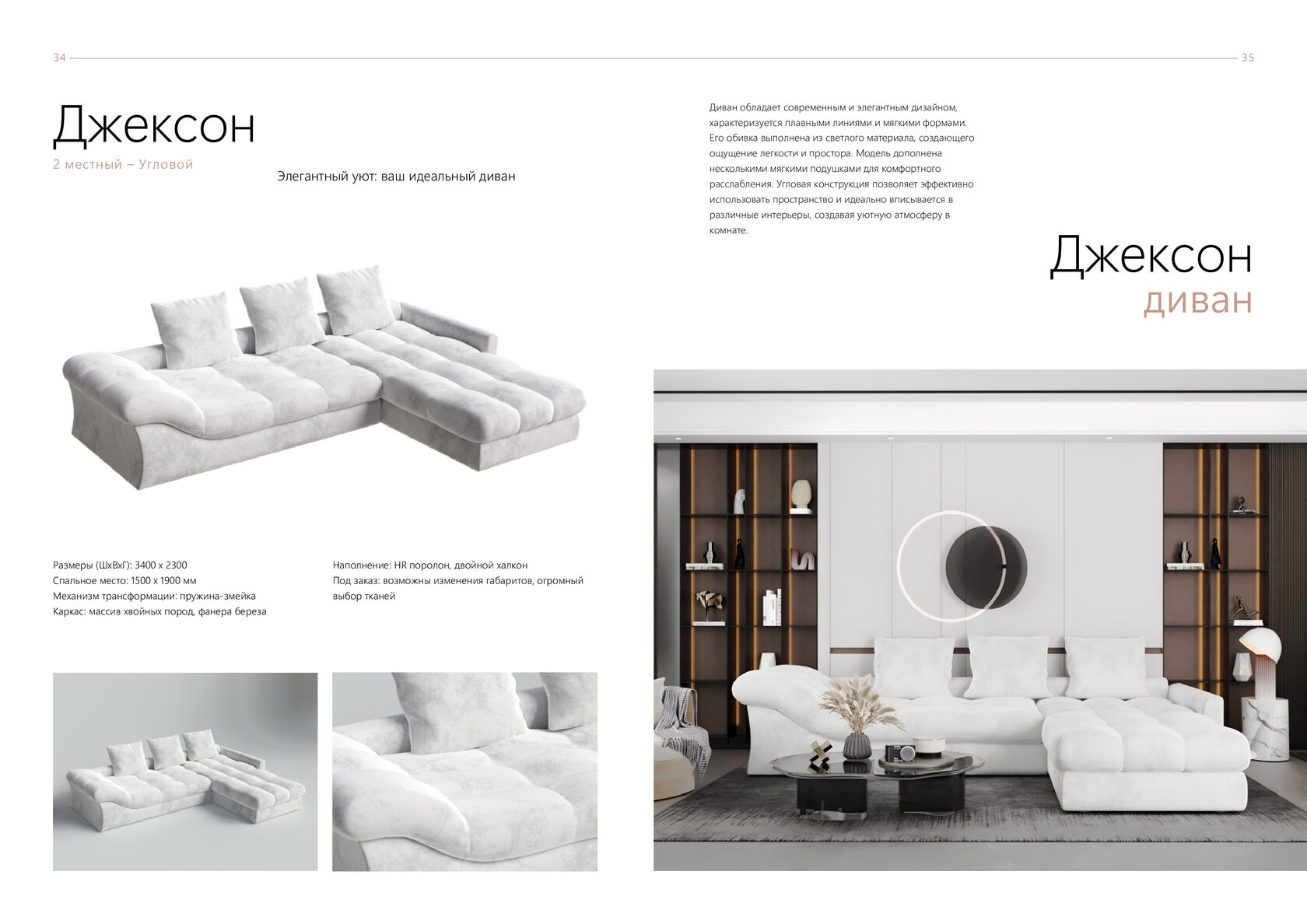 Размеры (ШхВхГ): 3400 x 2300 Спальное место: 1500 x 1900 мм Механизм трансформации: пружина-змейка Каркас: массив хвойных пород, фанера береза