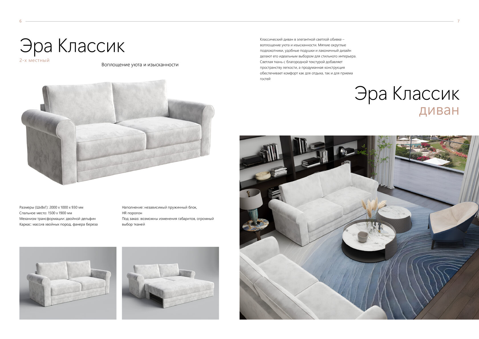 Размеры (ШхВхГ): 2000 x 1000 x 930 мм Спальное место: 1500 x 1900 мм Механизм трансформации: двойной дельфин Каркас: массив хвойных пород, фанера береза