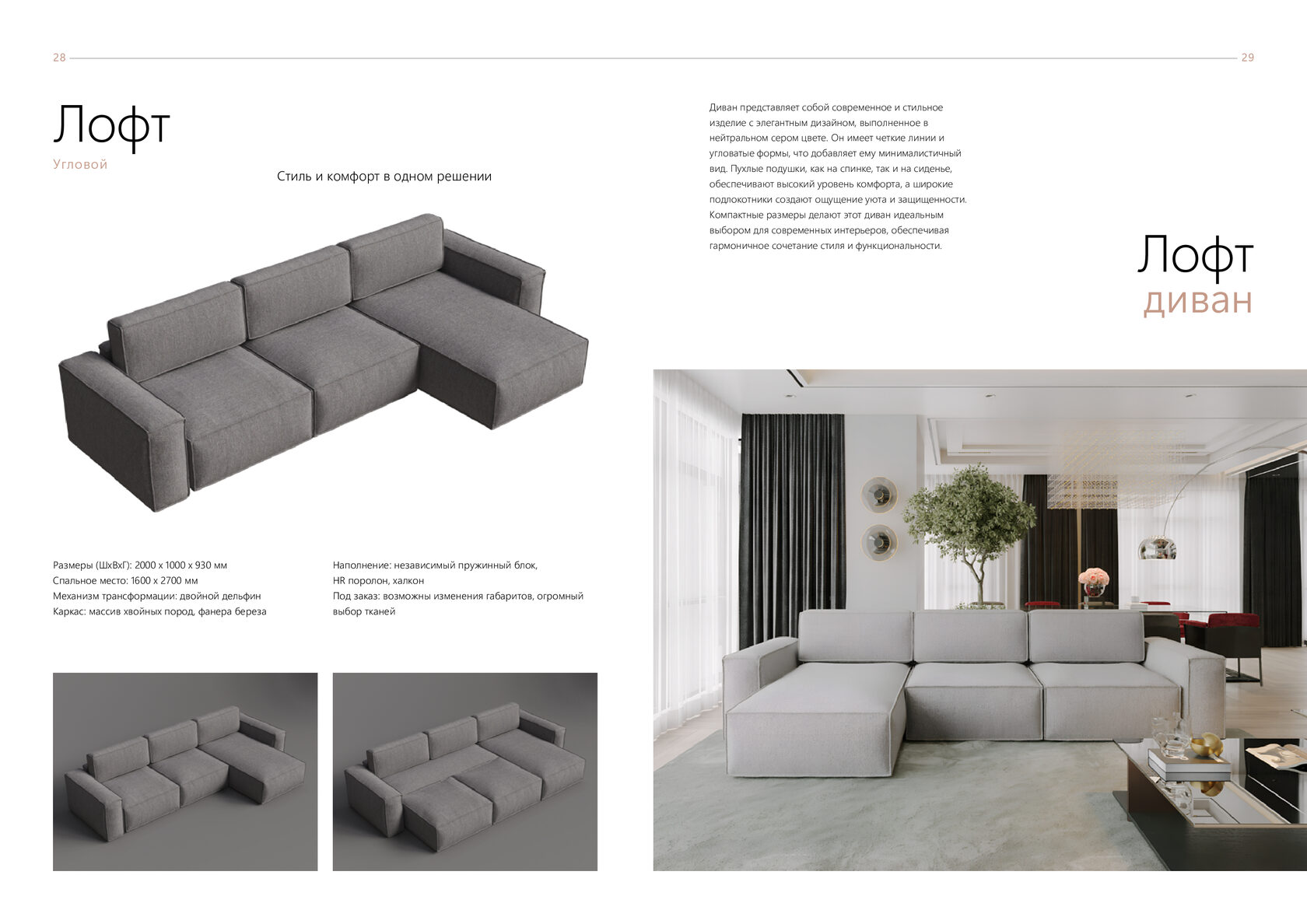 Размеры (ШхВхГ): 2000 x 1000 x 930 мм Спальное место: 1600 x 2700 мм Механизм трансформации: двойной дельфин Каркас: массив хвойных пород, фанера береза