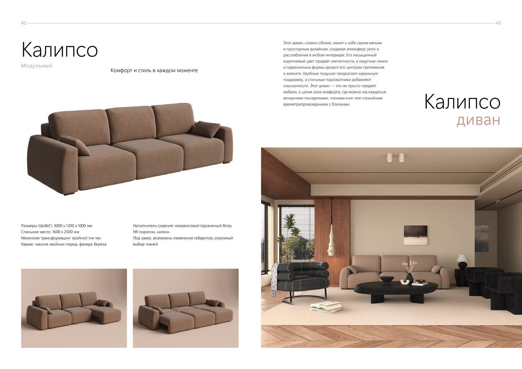 Размеры (ШхВхГ): 3000 x 1200 x 1000 мм Спальное место: 1600 x 2500 мм Механизм трансформации: тройной тик так Каркас: массив хвойных пород, фанера береза